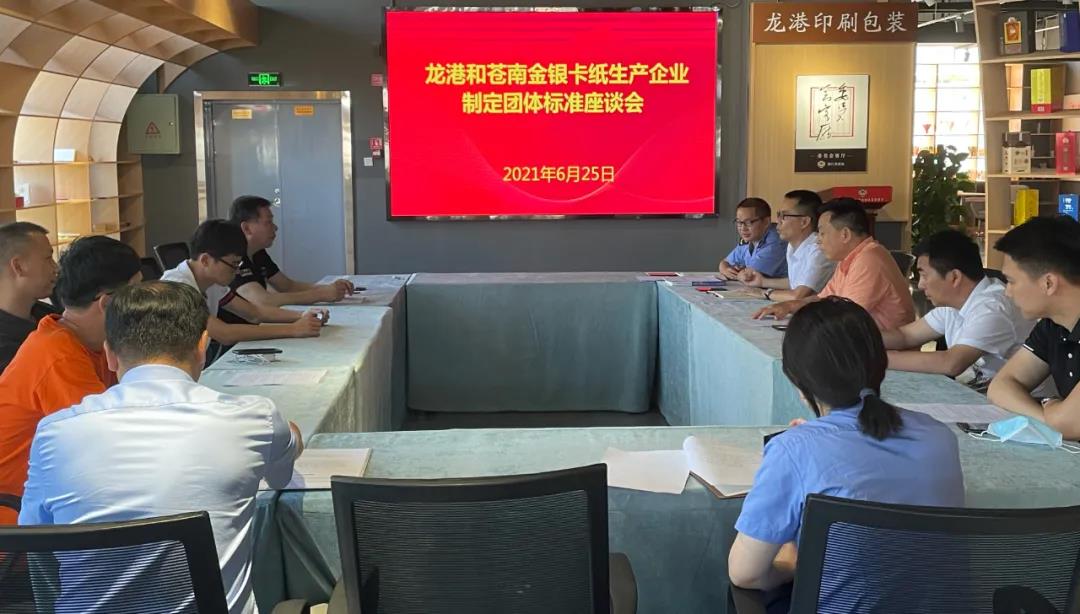 6月25日下午,龙港和苍南金银卡纸生产企业制定团体标准座谈会在龙港印刷包装政协委员会客厅举行,原材料供应企业代表董君沈、吴贤鎯、林维琳、朱其旦、黄益良、黄锋,与印刷企业代表陈如才、吴立生和龙港市质检院梁世何、许建华等人,就标准制订问题发表意见和建议。会议由龙港市印刷包装行业协会执行秘书长梁孝克主持。