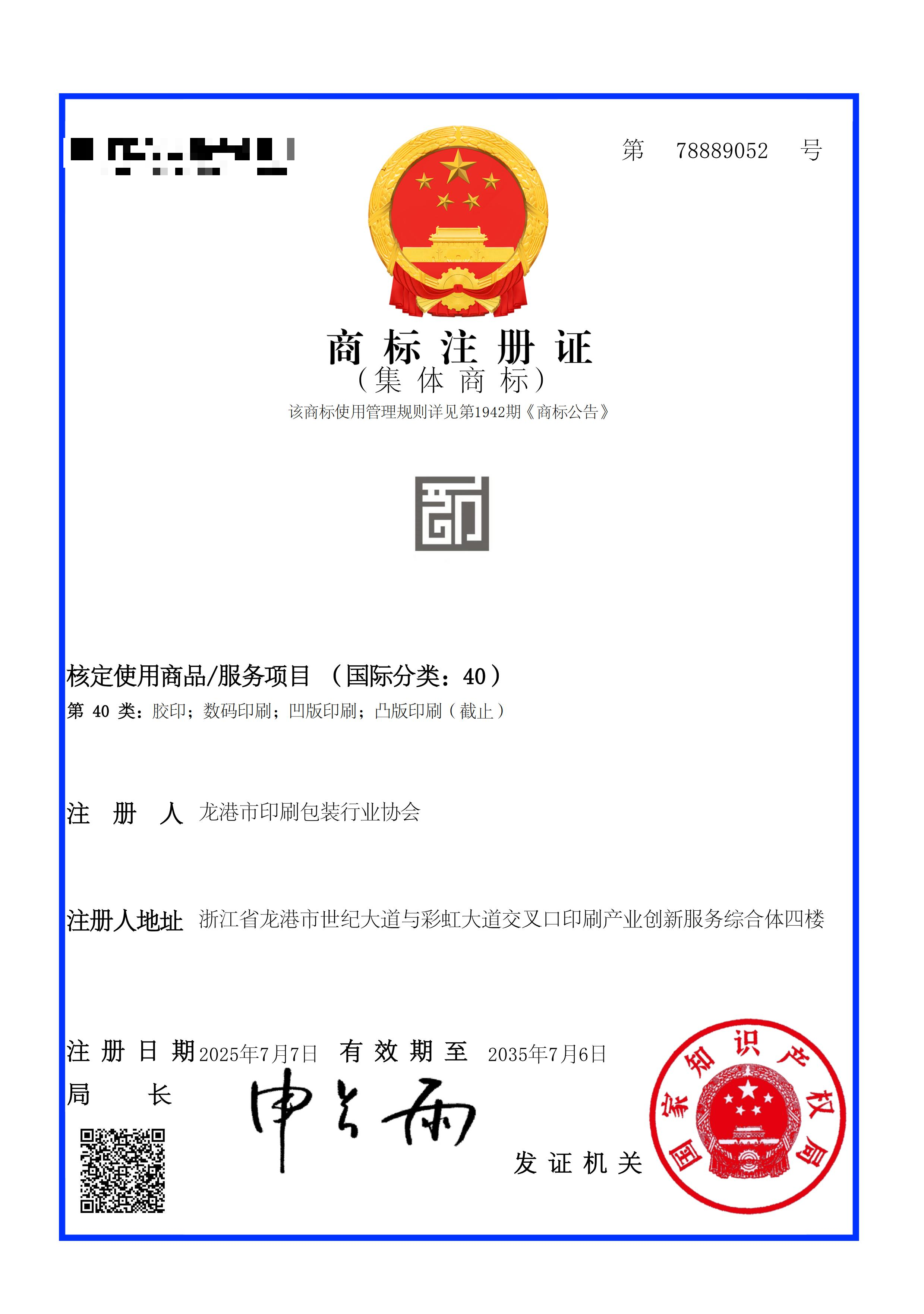 申报注册方龙港市印刷包装行业协会,系全国“四好”商会、5A级社会组织、浙江省品牌社会组织,先后荣获龙港市模范集体、温州市模范集体、温州市五星级清廉协会等荣誉,现有820家会员企业。商标权属协会内所有会员单位,会员单位如需使用该标志,可向协会申请,经授权后便可使用(具体情况咨询龙港印协秘书处64250181、18067760791)。协会将进一步强该集体商标宣传,聚力打响“龙港印刷”区域品牌,通过统一品牌形象提升市场辨识度和信誉度,为推动龙港印刷业高质量发展注入强劲动能。