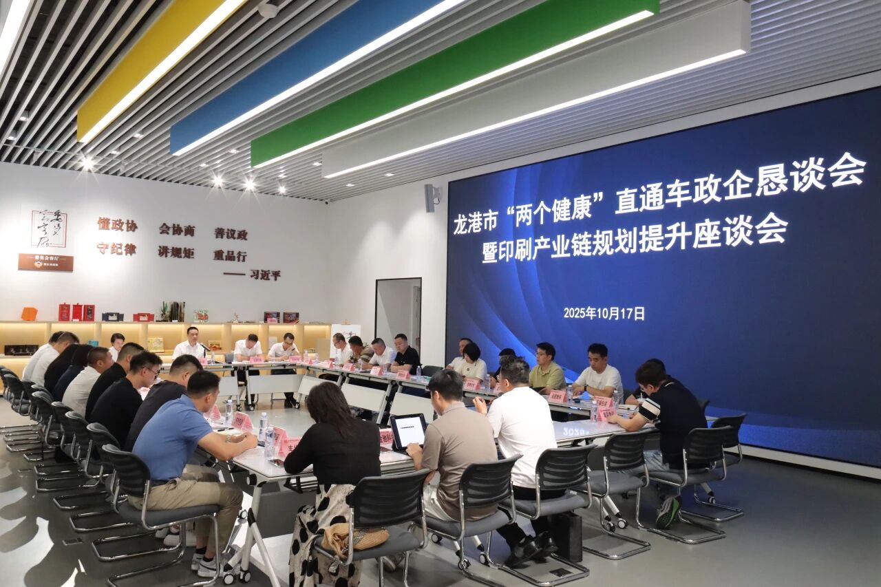 为精准对接印刷企业诉求、破解行业发展难题、统筹推进产业链规划升级,10月17日下午,龙港市“两个健康”直通车政企恳谈会暨印刷产业链规划提升座谈会,在龙港印刷包装政协委员会客厅顺利召开。市委常委黄振国主持会议,市印刷包装行业协会、浙江理工大学龙港研究院,及全市胶印、凹印、丝印、凸印、数码印刷、电商、材料等领域25家企业代表参会建言,市经发局局长吴艳、副局长郑国芋陪同参会。
