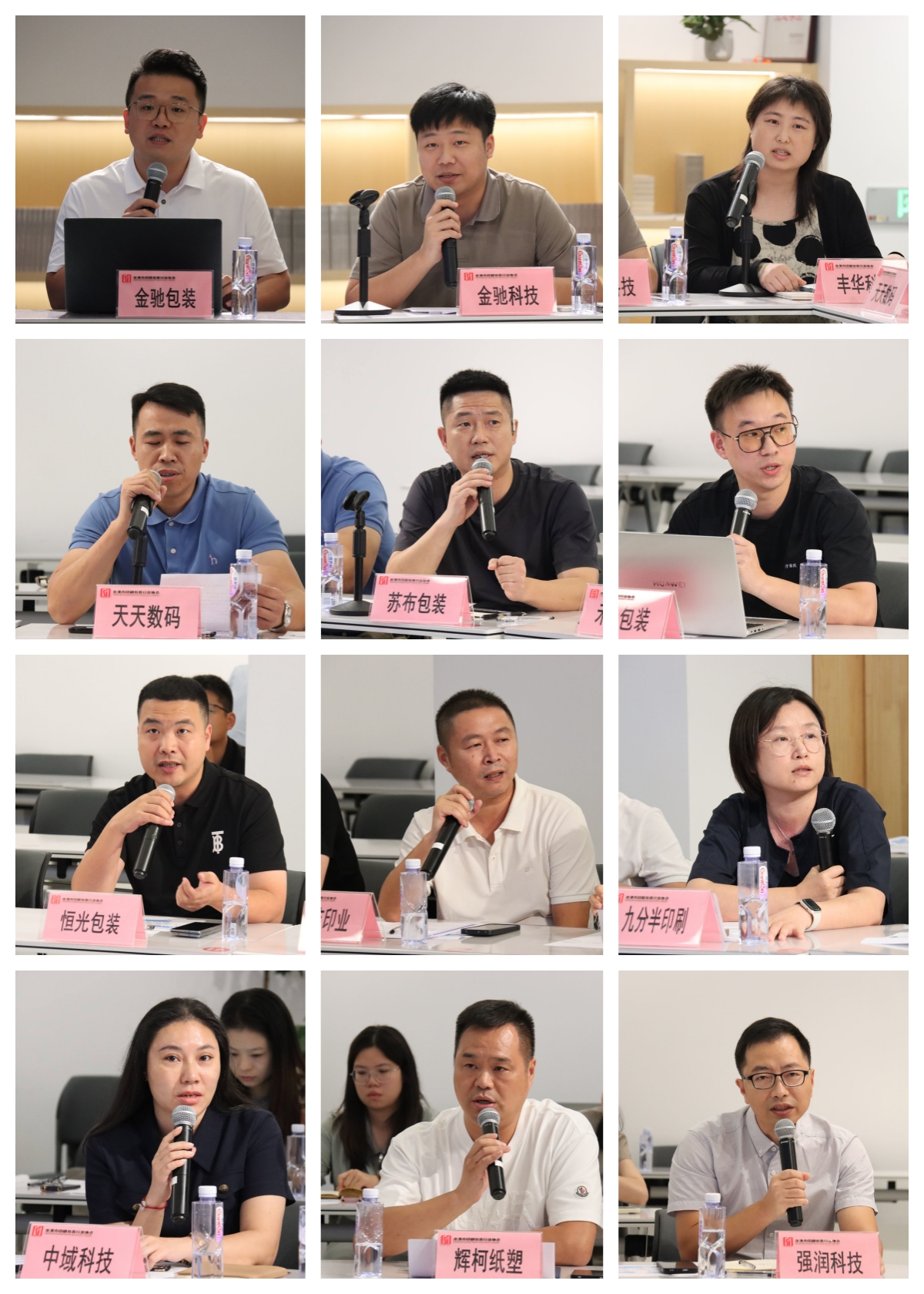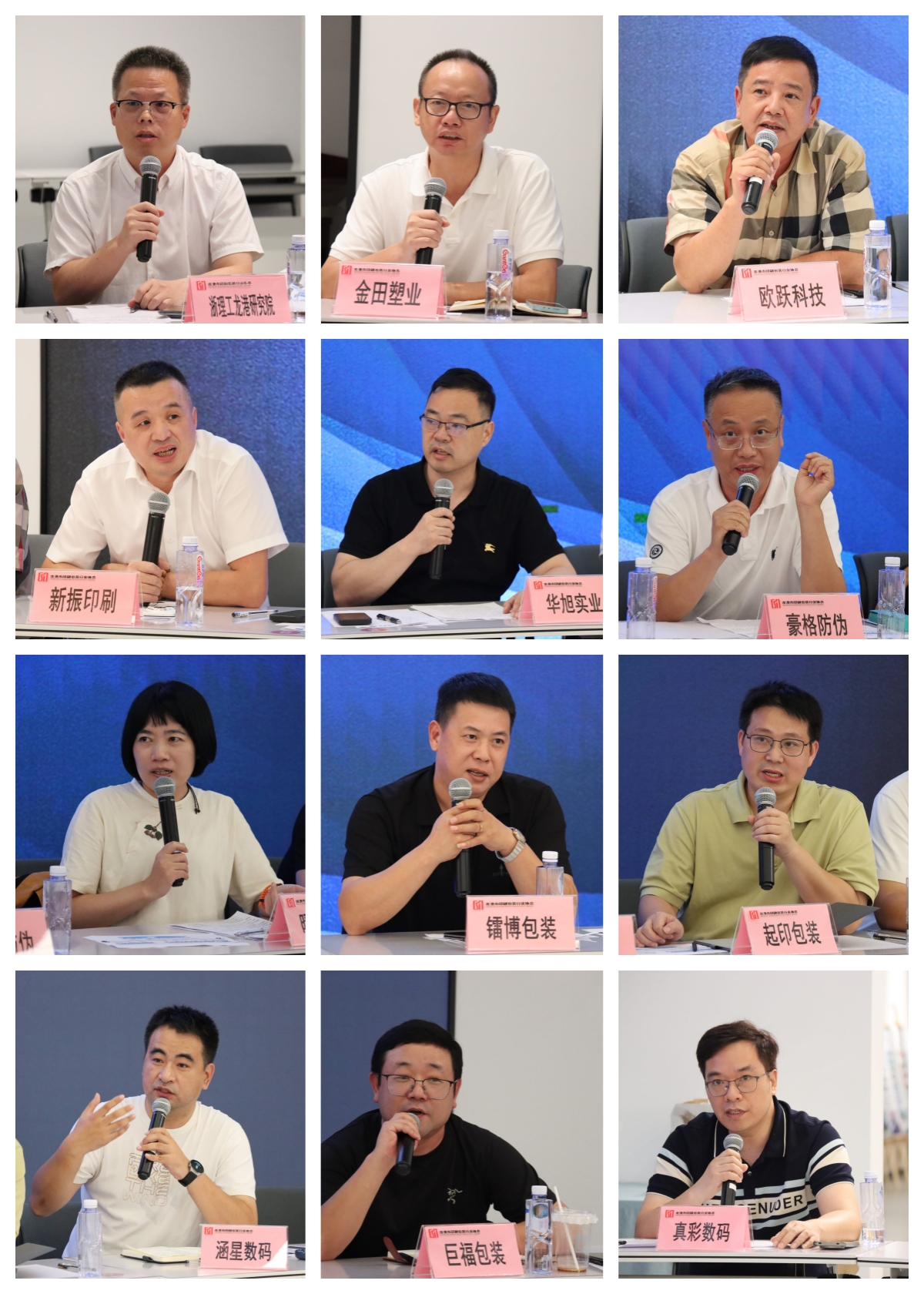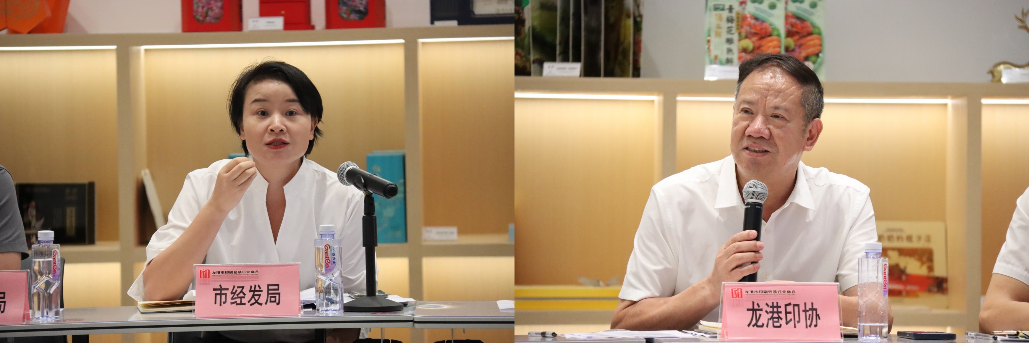 参加会议并发言的人员有龙港印协会长吴作榜、浙理工龙港研究院彭来湖、华旭实业杨介梁、新振印刷黄体新、豪格防伪张献藏、欧跃科技吴世具、辉柯纸塑汤志柯、晴耕雨读林开芬、中域科技林春芬、镭博包装陈修轩、金驰包装陈捷、金驰科技朱宏达、恒光包装章圣辉、起印包装江里福、巨福包装彭金华、禾氏包装陈生茂、九分半印刷黄秀珍、苏布包装黄光明、彩艺印业林圣贯、真彩数码陈加才、涵星数码金传亿、天天数码杨崇溪、金田塑业陈跃超、强润科技倪建国、丰华科技陈晓璐。