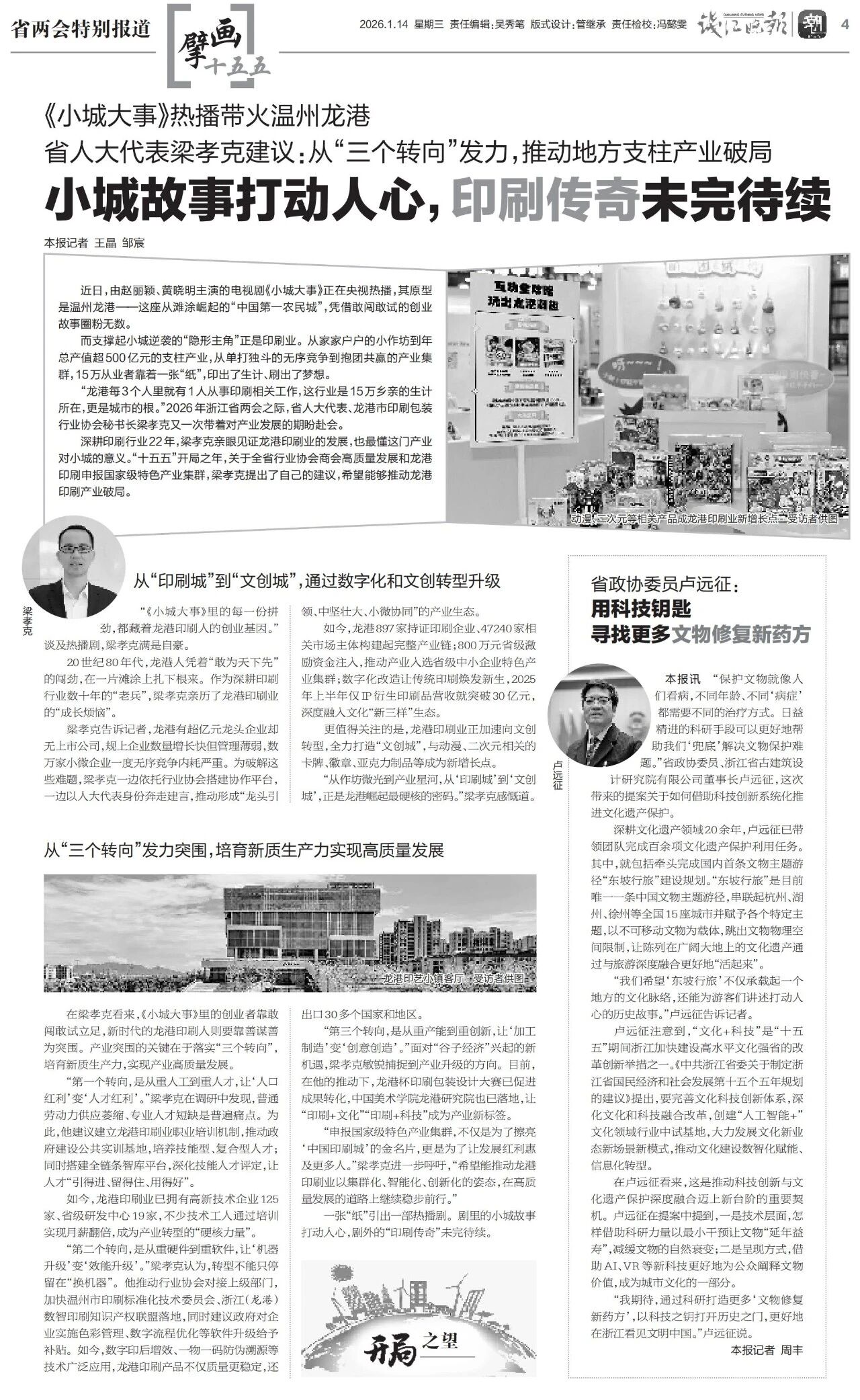“龙港每3个人里就有1个人从事印刷相关工作,这行业是15万乡亲的生计所在,更是城市的根。”1月13日,潮新闻记者在省两会温州代表团驻地专访梁孝克。