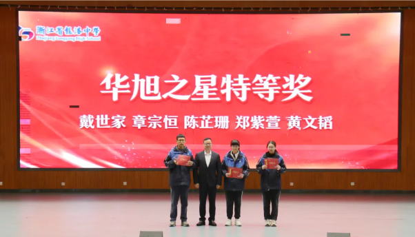 “华旭”奖学金共设立“华旭之星特等奖”“华旭卓越奖”“华旭精英奖”“华旭优秀奖”“华旭奋进奖”五类奖项,用以表彰在首考中表现突出的龙港学子。颁奖环节,浙江华旭实业有限公司依次为获奖同学颁发荣誉证书与奖学金,聚光灯下,荣誉证书熠熠生辉,会场内处处洋溢着榜样的荣光。